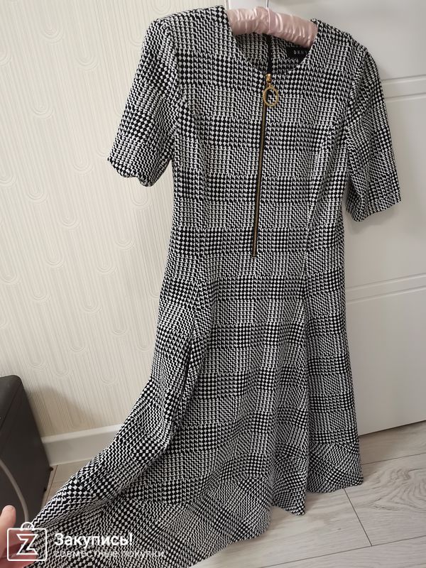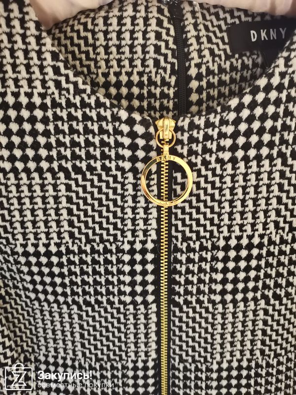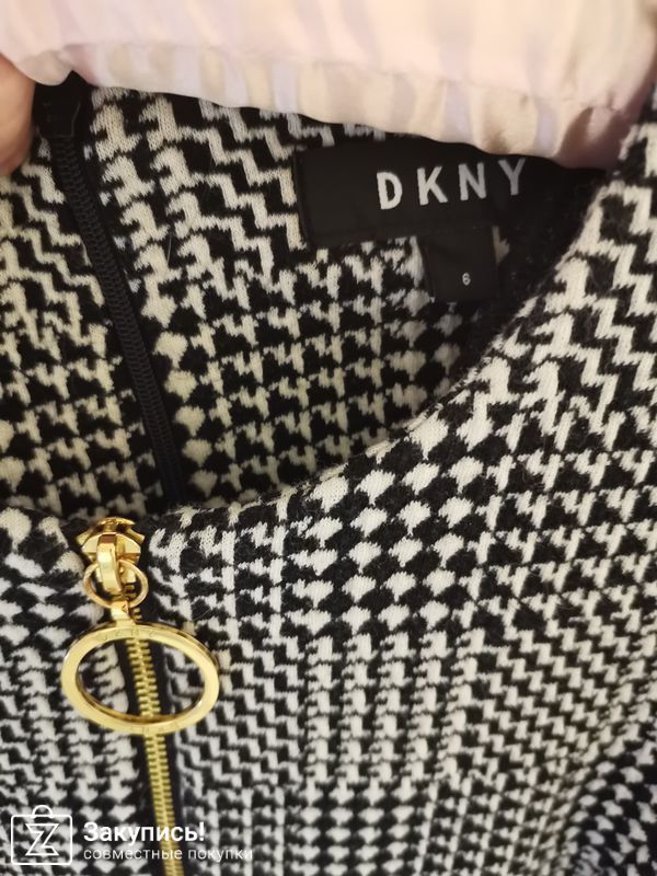 Платье фирмы DKNY, размер американский 6 на мой российский 42-44. Платье достаточно теплое, полностью синтетика, зато не мнется. Замок у платья золотистый, золото не стирается. Платье достаточно оригинальное, удобное, стильное, пошито качественно. Куплено с официального сайта донна карана.