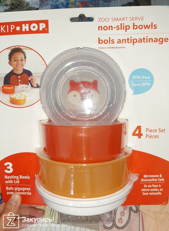 Skip hop. Набор тарелок (3 шт) + крышка. Пластмассовые, легкие, с низу антискользяшка. Удобство при хранении, тк складываются по типу матрешки. Крышка для самой большой тарелочки - можно транспортировать, либо хранить что то в холодильнике. Подходит для свч и посудомойки👍