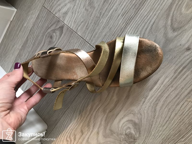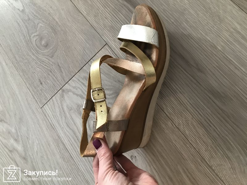 Босоножки. Вот тут слегка разочарована, если честно. Стелька кожаная, мягкая, вопросов нет. Но ремешки вроде бы не из кожи. Краска золотая и серебряная сверху потрескалась практически сразу. Сама танкетка тоже после лета носки ( не особо интенсивной) как-то поизносилась. В общем, от этой пары обуви я не особо в восторге. Хотя ноге в них очень удобно.