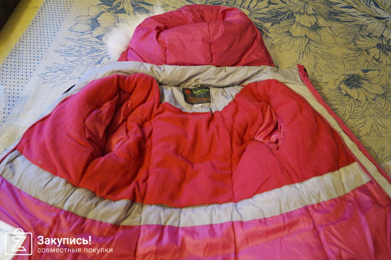 Капюшон очень большой. Внутренний воротник на куртке болонь. Мех тоже сомневаюсь что натуральный на капюшоне. По маркировке 122 см (-6см). Дочка ростом 107 см.