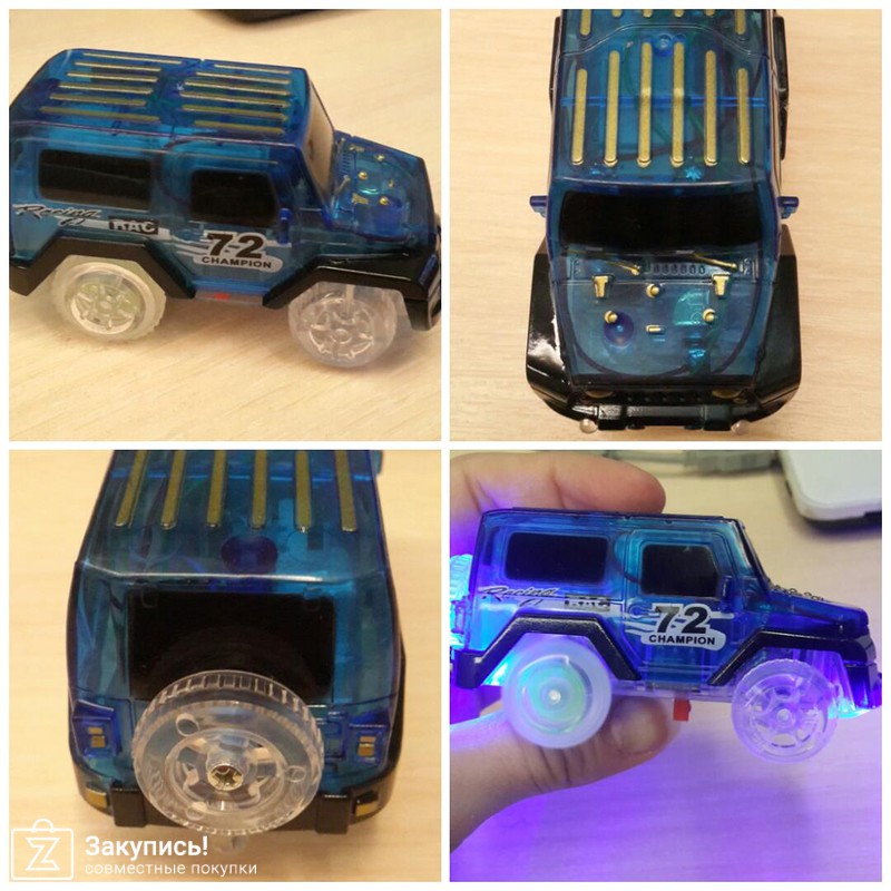 Все работает, все горит. Джипик синего цвета. 3 диода, горят по-разному (только красный, только синий, и вмеремешку за раз какие-то синим горят, какие-то красным. Прикольно! Ширина машинки 4 см. В темноте горит ярко.
