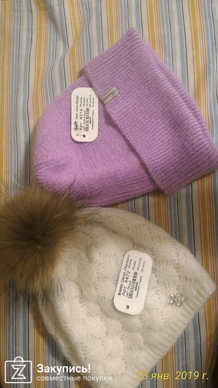 обе ей очень понравились, сразу у Ц.Р.и надела.)))) мне тоже очень понравились, качество на высоте, фасон интересный,, шапка не давит голову и сидит хорошо.Спасибо большое.