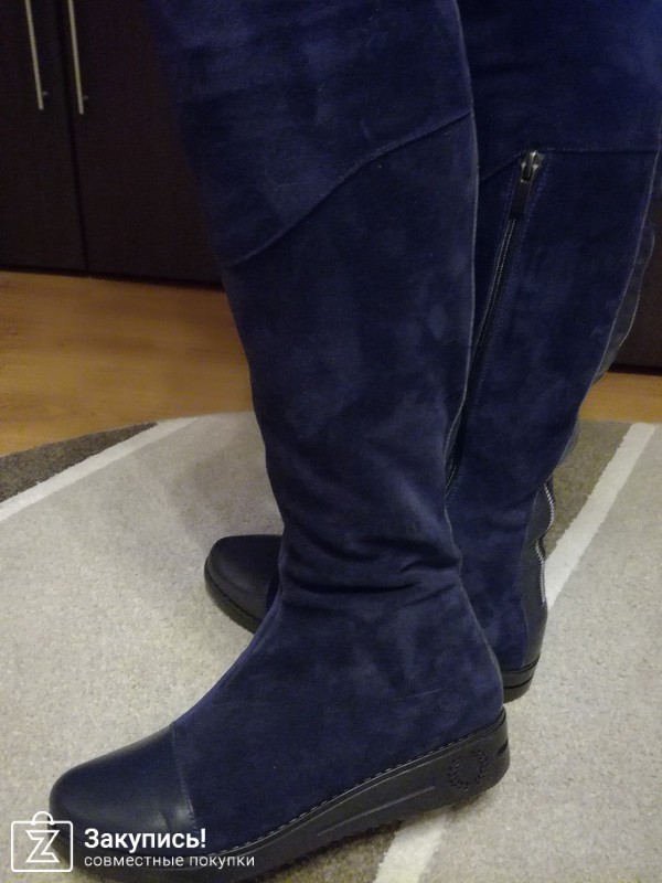 Брала сапоги ещё в ноябре) вот и до отзыва дошли руки))) Сапоги женские из натуральной замши черного цвета со шнуровкой сверху, на не высокой танкетке и утолщенной подошве, М-102- замечательные сапоги, заказ был в зимнем варианте. Покупала маме. Она очень довольна и ценой и качеством. Единственное они на НЕ худую ногу. Меняла на свою у меня в голяшке болтаются, даже шнуровка не помогла. Организатору большое спасибо за такую закупку.