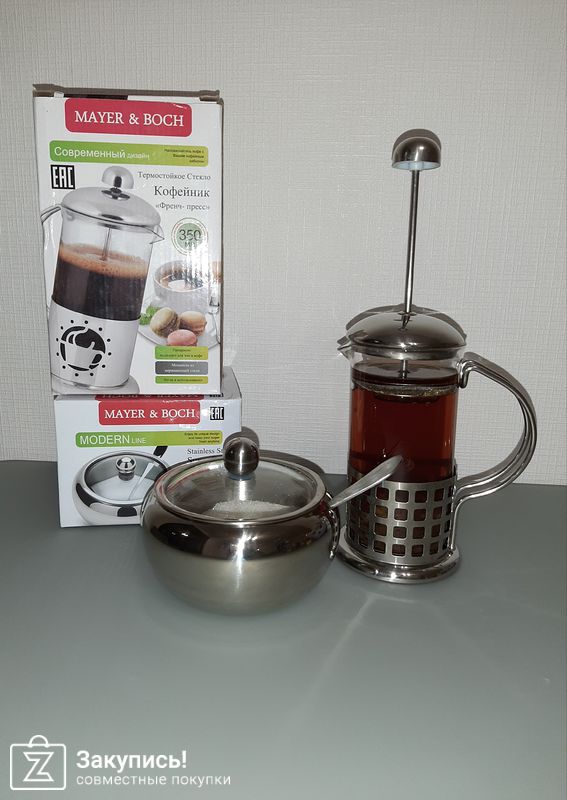 Сахарница - аккуратная, небольшая. френч-пресс 300 мл для меня идеально, изначально стекло показалось очень хрупким, в эксплуатации все отлично, видимо такое и должно быть))))