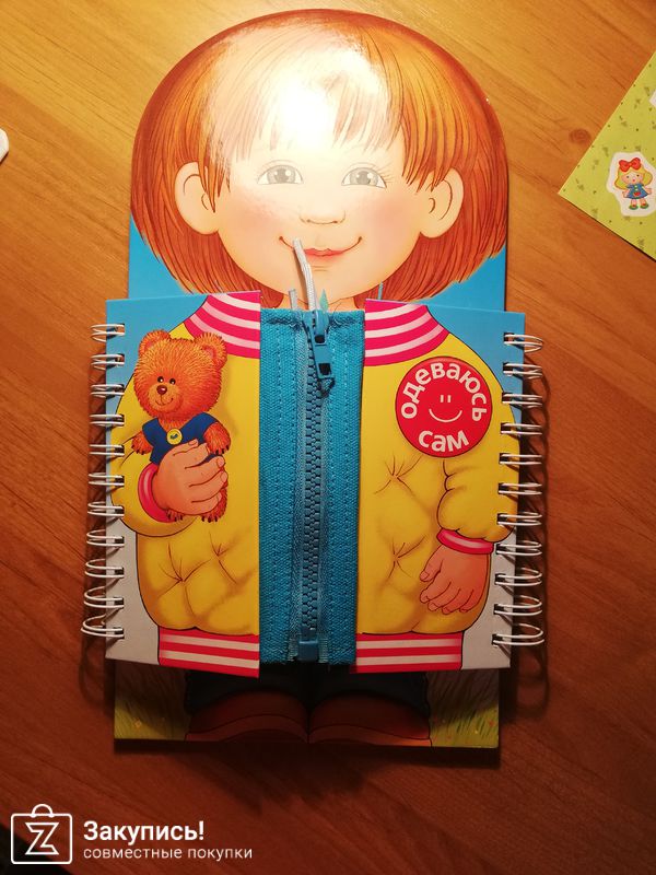 Добрый день. Рекомендую вам обратить внимание на книжку-тренажёр Одеваюсь сам. Мой вариант, как вы заметили, для мальчиков. Есть ещё вариант для девочек. Книга предлагает ребёнку научиться застегивать молнии, пуговицы, липучки, пряжки, а также завязывать шнурки и ленточки. Качество хорошее.