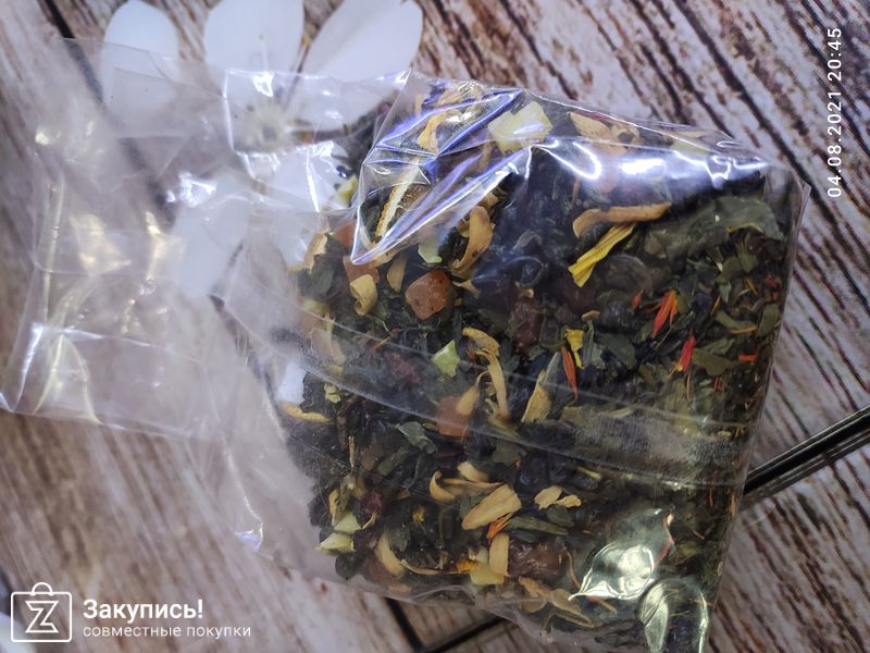 По факту в пакете ТРУХА, назвать это зеленым чаем язык не повернется. На уровне дешевых магазинных чаев. Обычно такая фракция характерна для травяных чаев. Покупая не пакетированный чай, ожидаешь получить ЛИСТ. Ну и в дополнение щепоть лепестков календулы.