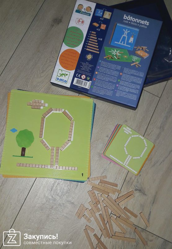 12 карточек: двустороние, жесткий глянец (хотелось бы матовые, палочки скользят) 3 уровня, нижний правый угол акцентирует об этом. Мини карточки идут как подсказка, на них обрисованы линии/квадратики.