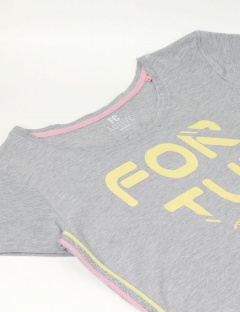 Футболка с короткими рукавами. Горловина обработана воротником из полотна с эластаном. Перед футболки декорирован принтом.