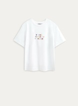 Футболка свободного силуэта. Спущенное плечо. Горловина из двух деталей, из рибаны. Декор: шелкотрафаретная печать.— Описание у На сайте поставщика