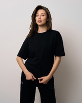 Boyfriend крой, укрепление по горловине спинки, круглый вырез. Горловина рибана. Отстрочка по горловине переда