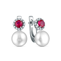 Серьги из серебра с культивированным жемчугом, синтетическим рубином и фианитами