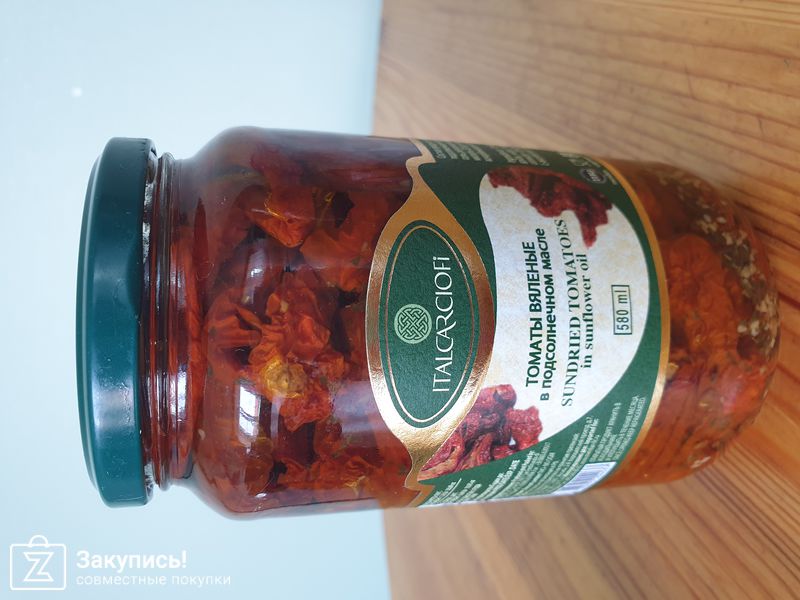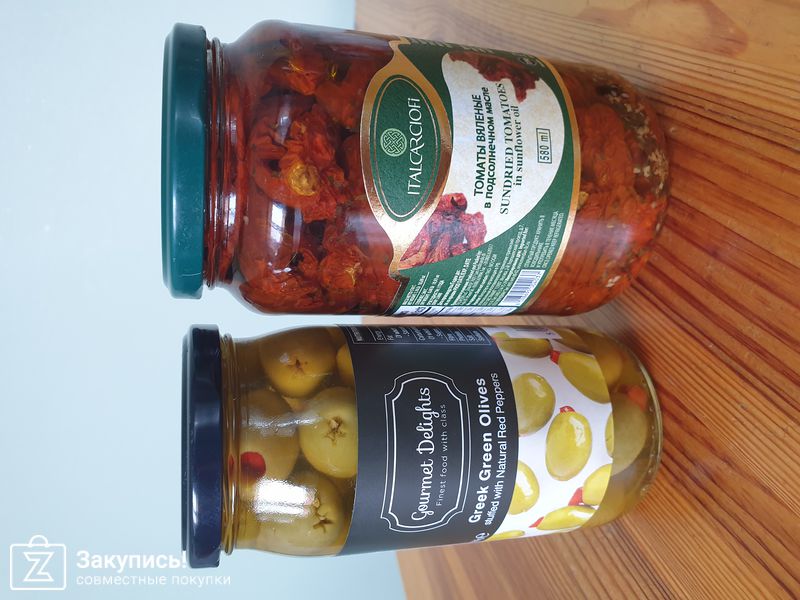 Итальянские вяленые томаты и греческие оливки, фаршированные красным болгарским перцем. В томаты влюбились сразу же всей семьей, заказала второй раз. Мне нравится упаковка, выглядит красиво. Такую банку и на подарок можно)