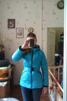 Артикул: 136 размеры 42-44(S) цвет светло-бирюзовый цена 2000р Куртка со смещенной застежкой,пояс в комплекте,длина изделия 62см,утеплитель-холкон бамбук