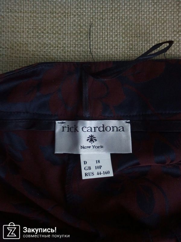 Заказывала брюки Rick Cardona 18 размер, мне оказались сильно велики в талии, но по ногам нормально, видимо лекало не мое. А так очень красивые (на синем шелковом фоне коричневые жакардовые цветы) и хорошо сшиты