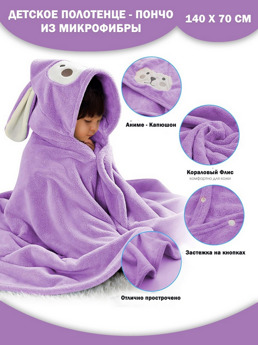 Детское полотенце с капюшоном "Кролик"- СИРЕНЕВЫЙ 70*140 см.на кнопках