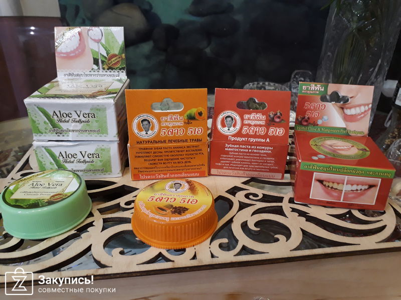 Пасты тайские во всем своем великолепии и разнообразии! Отличное качество,весьма приятная цена,а сортов таких я даже в Тае найти не смогла. Ну в Бангкоке -понятно,европейские марки повсюду замещают местные марки.Но на Пхукете выбор был,и то многих не было в продаже.Проверено на себе,кариеса не будет,если чистить зубы ею хотя бы 1р в день, а 2раз я чистила другого производства пастой.И ополаскиватель Листерин на ночь.И чудеса-за 1.5года,что не делала гигиену ,зубов с проблемой не возникло и налета почти не было.