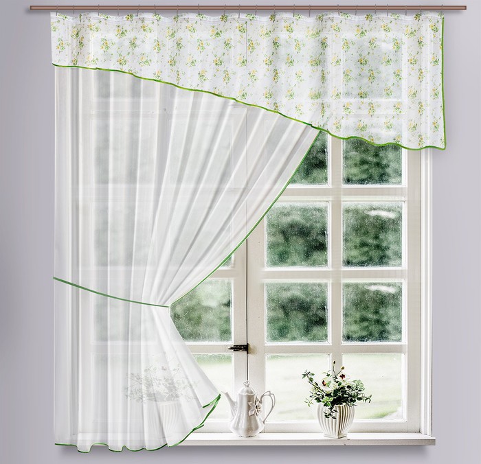 Занавеска из мягкой вуали средней прозрачности. состоит из 2-х частей, пришитых на одну шторную ленту. Украшена атласной бейкой. Максимальная высота ламбрекена - 75 см. Цвет ламбрекена - белый с зелеными цветами, цвет длинной шторы - белый. 100% полиэстер. светонепроницаемость -10-12%. Производство FIRANKA.
