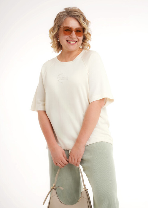 Джемпер свободного кроя из трикотажного полотна джерси. Короткий рукав реглан. Округлая горловина с обтачкой. По низу изделия кулиса с тесьмой. Спереди принт прорезинка.