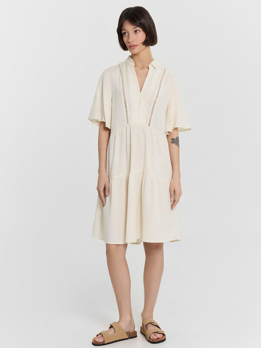 Очаровательное женское платье с широкими рюшами и изысканным ришелье — воплощение легкости, элегантности и романтичности! Короткие рукава и V-образный вырез с отложным воротником создают утонченный силуэт, подчеркивая линию шеи и ключицы. Застежка на пуговицах спереди до линии талии добавляет удобства, позволяя регулировать посадку и придавая модели классический акцент. Широкие рюши придают платью воздушность и нежность, добавляя динамику движению и создавая легкий, женственный образ. Ажурное ришелье дополняет стиль, привнося нотку изысканности и винтажной романтики. Смесовой материал — сочетание вискозы, хлопка и льна — обеспечивает идеальный баланс легкости, воздухопроницаемости и мягкости. Лен гарантирует прочность и свежесть, вискоза — приятную струящуюся текстуру, а хлопок — комфорт при носке. Это платье — универсальный вариант для летних прогулок, романтических встреч, отдыха на природе и даже особых событий. Легко комбинируется с босоножками, аксессуарами и лёгкими жакетами, создавая выразительные стильные образы.
