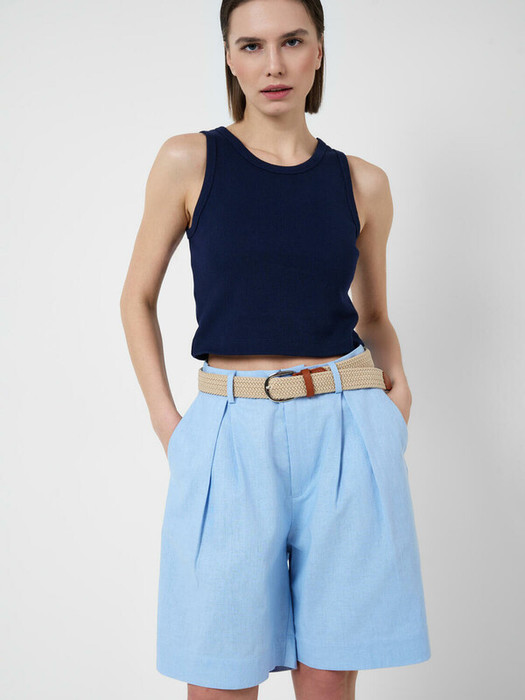 Классические женские льняные шорты. Модель средней длины, чуть выше колена. Комфортная посадка и прямой силуэт, который немного расширяется к низу. Шорты застёгиваются на молнию и пуговицу, и имеют боковые карманы. Пояс дополнен шлёвками для ремня.