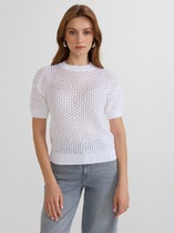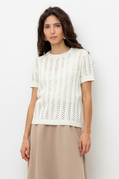 Джемпер из итальянской хлопковой пряжи выполнен ажурной, воздушной вязкой. Молочный цвет и фактура делают его универсальным для различных образов.