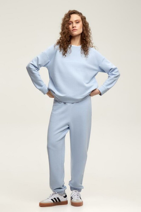 Объемный свитшот из двухцветного трикотажного футера. Внутренняя сторона изделия представлена в натуральном цвете хлопка, внешняя в нежно-голубом. За счет использования крашенной пряжи, данный вид полотна прошел минимальную обработку, что придало изделию мягкость и шелковистость.
