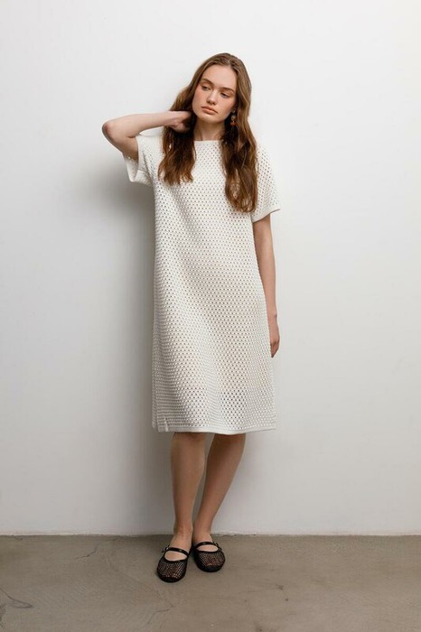 Платье ажурной вязки в молочном оттенке из итальянского хлопка. Дополняет изделие внутренний невесомый подклад из премиального бифлекса телесного цвета. Хлопок в составе сохраняет форму и дарит ощущение комфорта во время носки.
