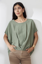 Платье с воротником из плотного набивного трикотажа интерлок. Модель с короткими рукавами, юбкой в складку и декоративными застроченными складками по груди.