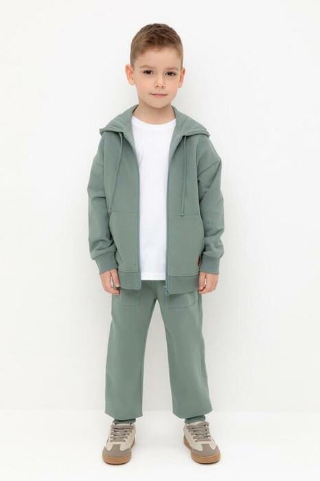 Брюки для мальчика из мягкого петельчатого трикотажа. Эластичный пояс на резинке регулируется по ширине с помощью шнурка. По бокам два удобных накладных кармана. Внизу эластичные манжеты.