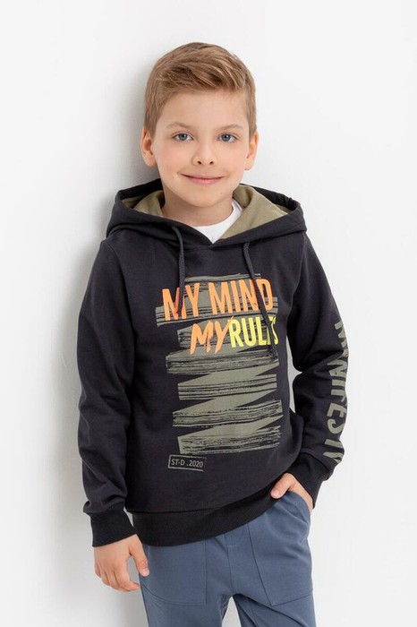 Толстовка с капюшоном для мальчика из однотонного петельчатого футера. Манжеты и пояс из эластичного трикотажа в рубчик. Спереди принт.