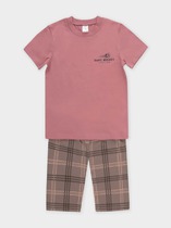 Трикотажная пижама из натурального хлопка. Футболка с короткими втачными рукавами и прямые брюки с эластичной резинкой в поясе. Оригинальные набивка и принт выполнены из стойких гипоаллергенных текстильных гипоаллергенных красителей. Изделие сохраняет цвет и форму после многократных стирок. Все трикотажные полотна производятся в соответсвии с нормами швейцарского сертификата ЭкоТекс.