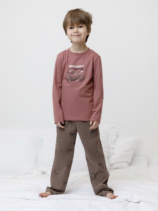 Пижама для мальчика из натурального хлопка. Джемпер с длинными втачными рукавами и прямые брюки с эластичной резинкой в поясе. Оригинальная набивка и принт выполнены из стойких текстильных гипоаллергенных красителей. Изделие сохраняет цвет и форму после многократных стирок. Все трикотажные полотна производятся в соответствии с нормами швейцарского сертификата ЭкоТекс.