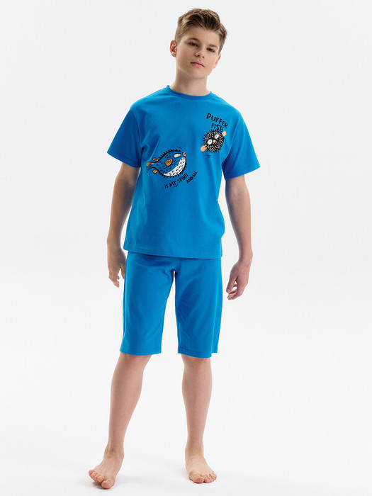 Стильная и уютная пижама для мальчика. В составе ткани 100% хлопка — идеально для детской домашней одежды! Футболка и удлиненные шорты, плечо спущено, рукава широкие и свободные — пижама на мальчика очень удобна для сна. Широкая и мягкая резинка в поясе шортов не перекручивается и не давит. Отделка горловины из эластичной рибаны — она не растягивается, ребёнку удобно надевать и снимать пижаму. Перевод надписей: "рыба фугу мое тотемное животное"