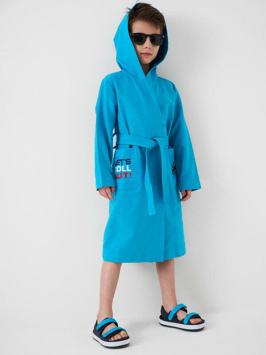 Детский халат для мальчика. Выполнен из мягкой микрофибры ярко-голубого цвета. Мягкий и быстросохнущий материал. Спереди два удобных накладных кармана, на которых размещены цветные принты. Халат фиксируется на теле поясом, который продет через шлевки. В комплект входит удобный мешочек для хранения — из сетчатого материала с кантом и завязкой.