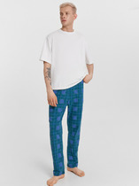 Костюм мужской, состоящий из футболки и брюк. Футболка однотонная с принтом на груди; модель свободная, со спущенной линией плеч. Брюки из полотна с набивным рисунком в узкую черно-белую полоску, прямые, с боковыми карманами с обтачными входами, на притачном поясе с отстроченной эластичной тесьмой.