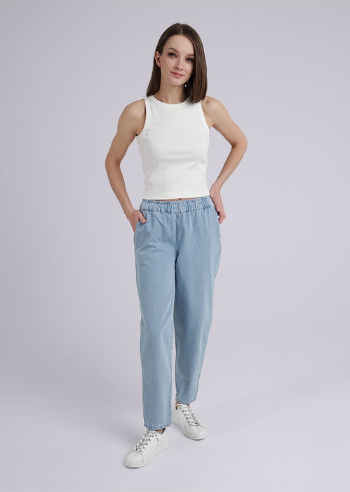 Широкие прямые джинсы светло-голубого цвета подойдут на любой тип фигуры, благодаря резинке по талии и кулиске.