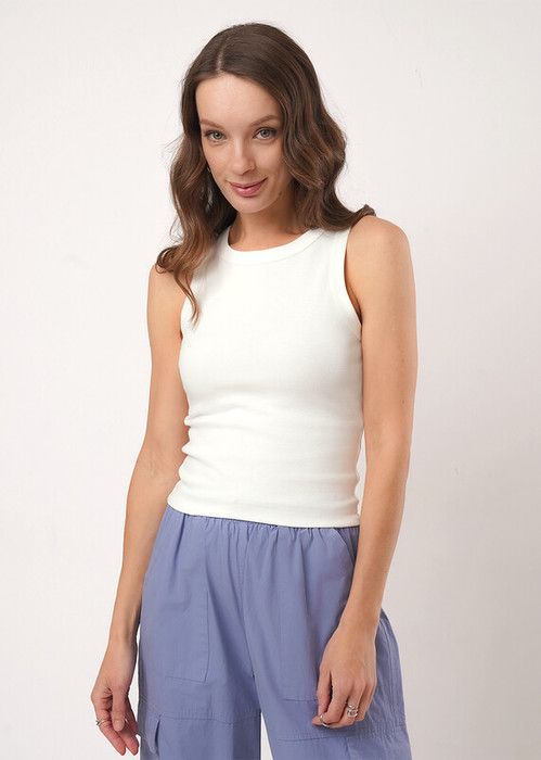 Майка из трикотажного полотна - рибана. Умеренный объем. Широкая бретель,округлая горловина. По пройме и горловине окантовка.