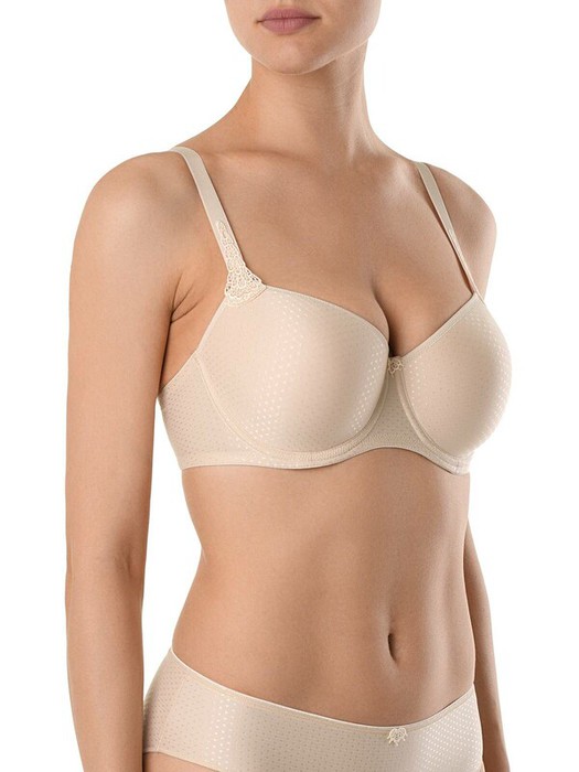 Бюстгальтер серии VOYAGE отличается чистотой линий и исключительным комфортом. Выполненный из полотна с деликатным жаккардовым рисунком «в горошек» и украшенный аппликациями макраме, бюстгальтер поможет создать одновременно простой и утонченный образ. В бюстгальтере используется «дышащий» материал spacer. Преимущества модели:- формованная чашка spacer, на каркасах;- чашка покрыта жаккардовым полотном;- вышитые аппликации макраме. - абсолютный комфорт на протяжении всего дня.