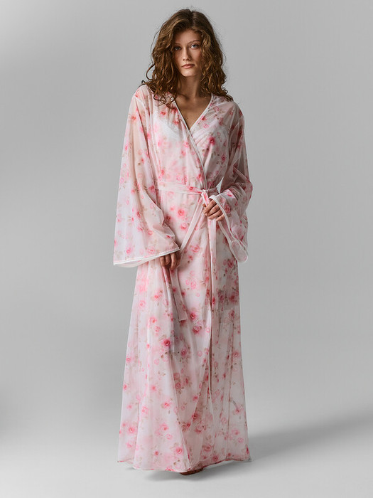 Халат женский А-силуэта, длинный. Горловина V-образной формы. Рукава втачные длинные, широкие. По боковым швам в районе талии настрочены шлевки и вставлен пояс из основного полотна. В районе талии с внутренней стороны притачаны завязки из основного полотна для фиксации полы халата. Борта, горловина спинки, нижние срезы рукавов обработаны тесьмой эластичной с зубом 12 мм (10/12) (KTE2-12 Arteks E2257). Нижний срез халата окантован бейкой из основного полотна.