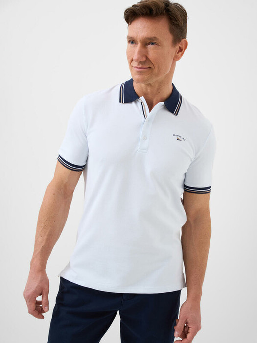 Мужская футболка-поло. Модель прямого кроя, средней длины с короткими рукавами. Выполнена из мягкого, хлопкового трикотажа пике. На груди расположен аккуратный принт. Застежка на три пуговицы. По бокам — небольшие разрезы с контрастной отделкой.