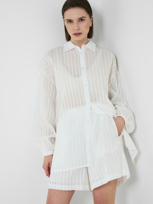 Легкий женский хлопковый костюм. Рубашка оверсайз с длинным рукавом и застежкой на пуговицы. Классический воротник, боковые разрезы. Манжеты на резинке. Свободные шорты на резинке.
