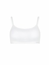 Бюстгальтер формы Soft bra с мягкими чашками, без каркасов и боковых корсетных вставок, выполнен из нежного материала в рубчик. Подклад в передней части и съемные формованные чашки. Эластичное кружево по верхнему срезу и резинка, с вывязанной полоской контрастного цвета, украшают изделие. Однотонные регулируемые бретели не отстегиваются. Без застежки.