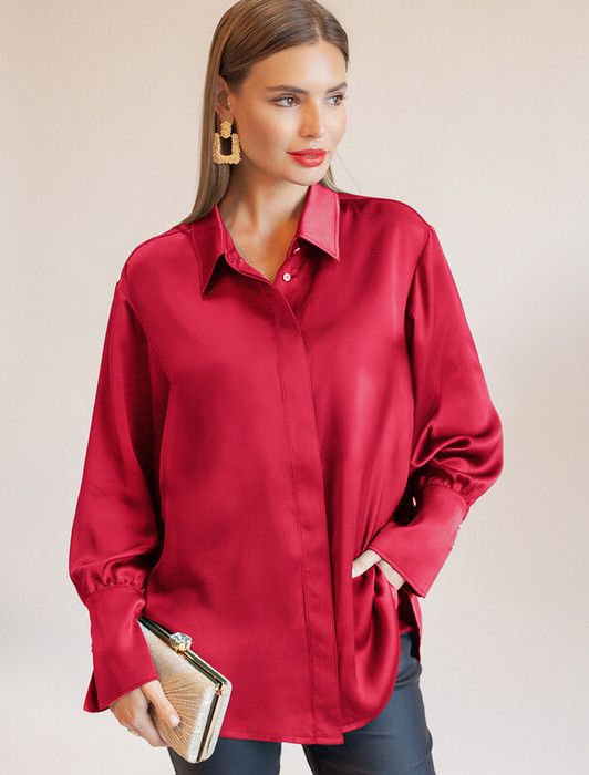 Блузка с удлиненными манжетами выполнена из тончайших нитей плотного сатина, плетение которых создает полуматовый блеск, напоминающий натуральный шёлк. На спинке изделия фирменный логотип бренда. Застежка на золотистые пуговицы. Совет стилиста: сочетайте блузку в костюме с брюками D24.534 и юбкой D26.461 чтобы создать роскошный праздничный образ, с классическими брюками или блестящим денимом.