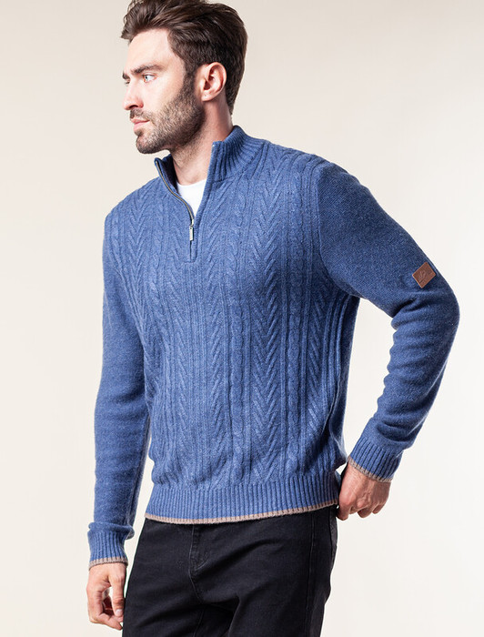 Свитер фактурной крупной вязки с узором косы дополнен металлической молнией на вороте. Модель выполнена их теплой пряжи с шерстью. Отлично держит тепло, при этом не перегревая. Дополнит как повседневный образ, так и нестрогий офисный комплект, с рубашками, футболками или водолазкой. На рукаве изделия нашивка бренда из эко-кожи.