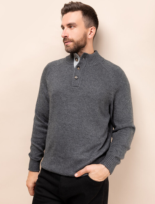 Свитер плотной вязки с застежкой на акцентные черепаховые пуговицы. Модель выполнена из теплой пряжи с шерстью. Внутри стойки контрастная пряжа, с помощью пуговиц можно регулировать высоту воротника и носить свитер как джемпер. Гармонично дополнит как повседневный образ, так и нестрогий офисный комплект, с рубашками, футболками или водолазкой. Модель дополнена фирменным логотипом бренда.