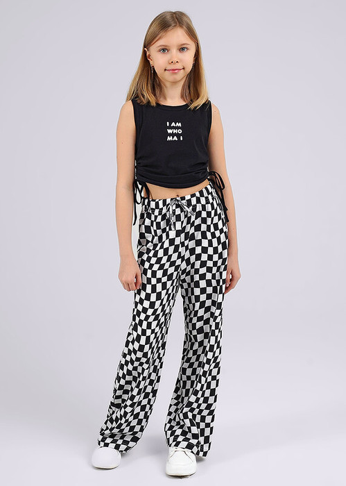 Стильные брюки из пике идеально подойдут для твоих летних образов! Модель сочетает в себе сразу 2 тренда: принт ""шахматка"" и расклешеный силуэт. Эластичный пояс обеспечит комфортную посадку. Модель легко сочетается с любыми футболками и рубашками.