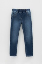 Джинсы для девочки на резинке с отворотами и потертостями. Сзади и по бокам карманы. Пояс на резинке с закрепами для ремешка. Спереди имитация гульфика.