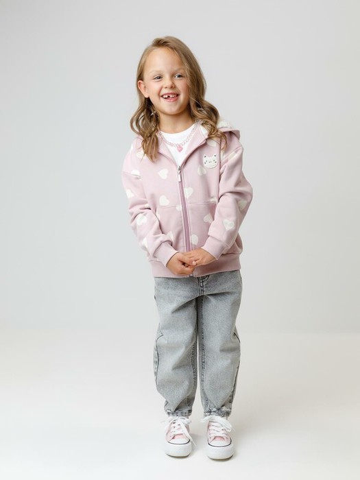 Толстовка для девочки со спущенными плечами. Изготовлена из высококачественного петельчатого футера трёхнитки. Застёгивается на молнию. В капюшоне мягкий подклад из флиса с длинным ворсом. Манжеты и пояс выполнены из эластичного полотна. Спереди удобный вместительный карман-кенгуру. Изделие сохраняет цвет и форму после многократных стирок. Все трикотажные полотна производятся в соответствии с нормами швейцарского сертификата ЭкоТекс.