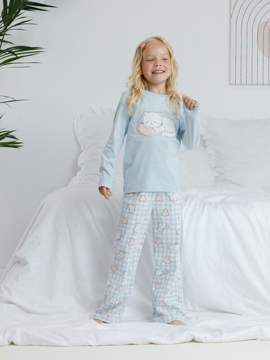 Пижама для девочки из натурального хлопка. Джемпер с длинными втачными рукавами и прямые брюки с эластичной резинкой в поясе. Оригинальная набивка и принт выполнены из стойких текстильных гипоаллергенных красителей. Изделие сохраняет цвет и форму после многократных стирок. Все трикотажные полотна производятся в соответствии с нормами швейцарского сертификата ЭкоТекс.