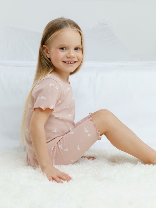 Трикотажная пижама в рубчик из натурального хлопка. Футболка с короткими втачными рукавами и шорты с эластичной резинкой в поясе. Оригинальная набивка выполнена из стойких текстильных гипоаллергенных красителей. Изделие сохраняет цвет и форму после многократных стирок. Все трикотажные полотна производятся в соответсвии с нормами швейцарского сертификата ЭкоТекс.